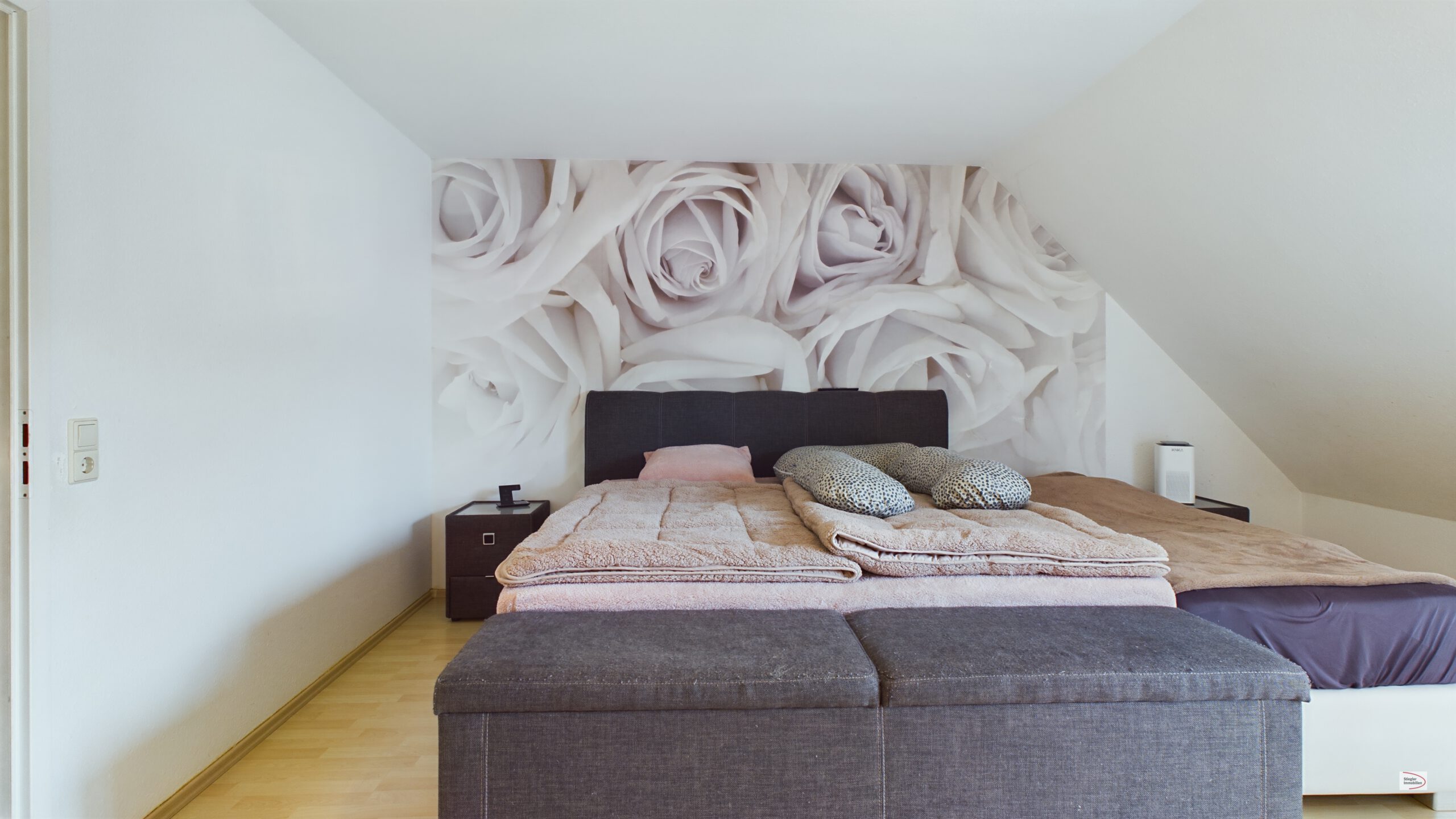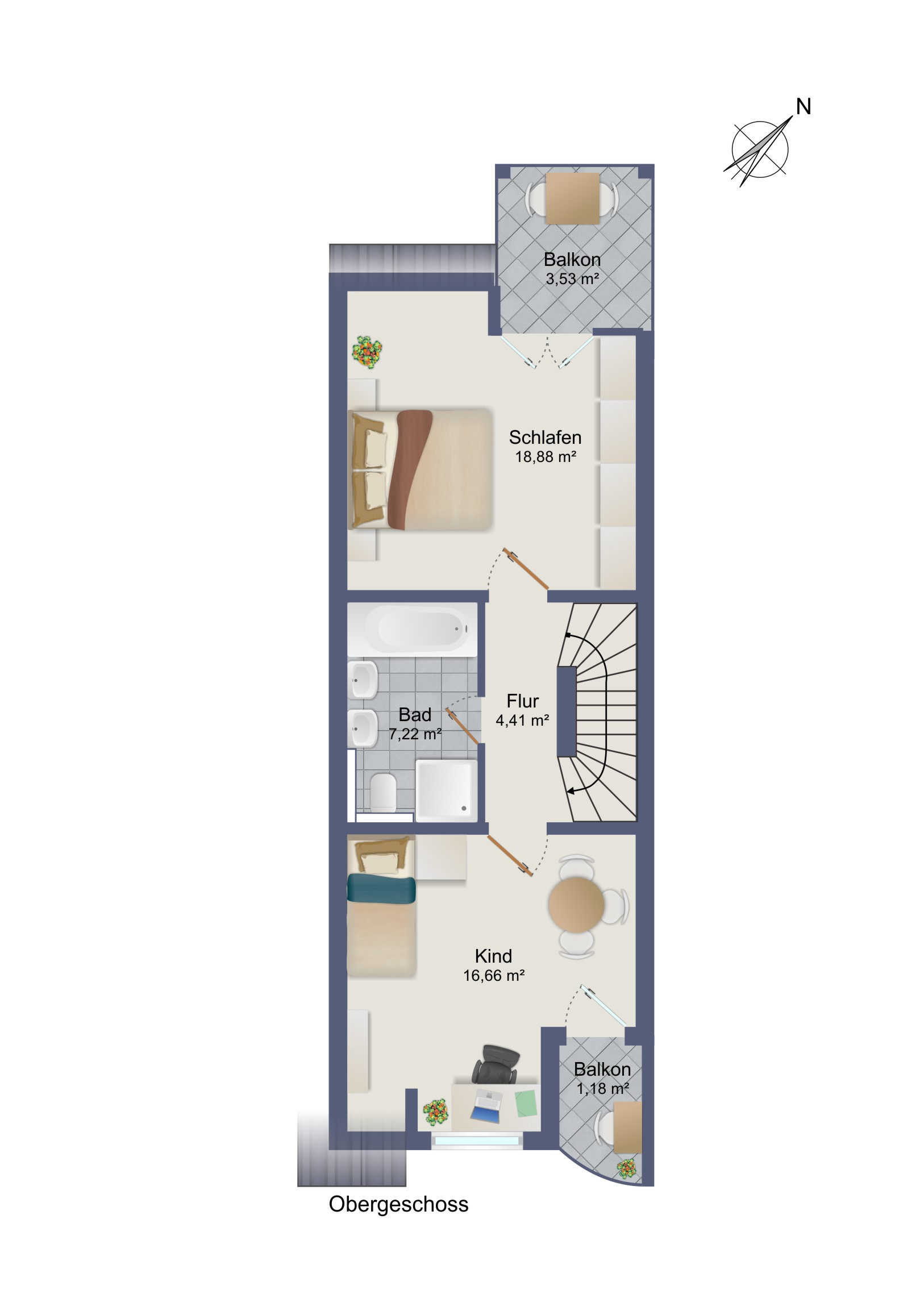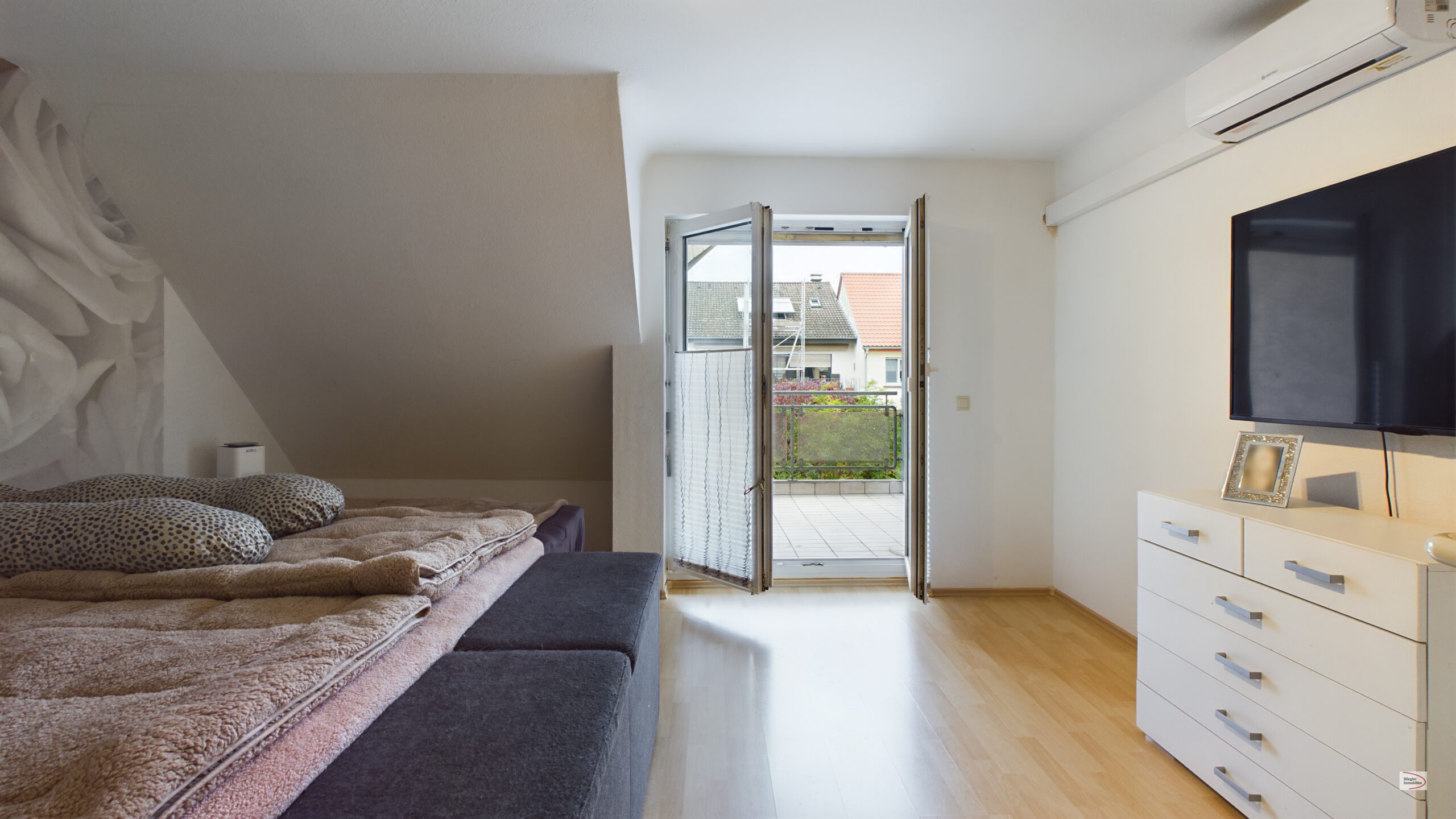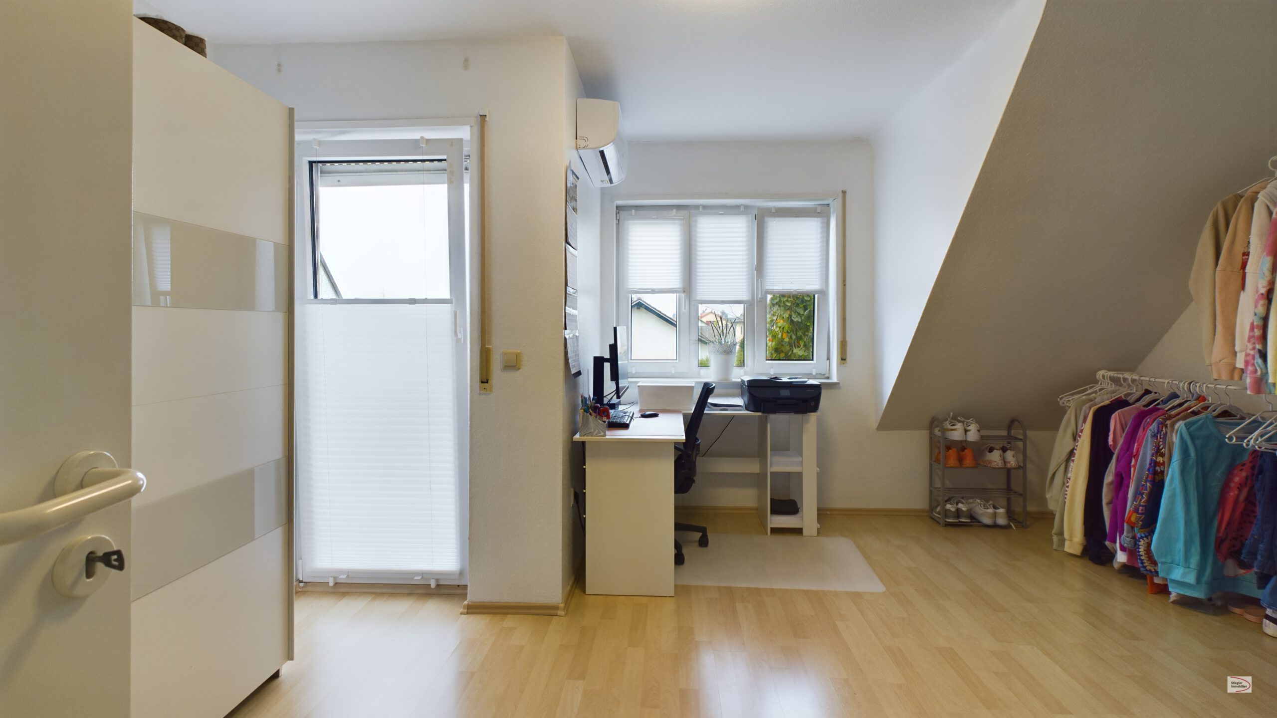 Im Erdgeschoss gelangen Sie über eine Diele zur Küche und zu einem großzügigen Wohn-Esszimmer mit Zugang zur liebevoll angelegten und teilweise überdachten Terrasse (zusätzlich mit Sonnensegel ausgestattet), die in 2020/2021 komplett erneuert wurde. Die komplett ausgestattete Einbauküche ist bereits im Kaufpreis enthalten. Ein praktisches Gäste-WC ist im Erdgeschoss ebenfalls vorhanden. Im Obergeschoss befindet sich das Eltern-Schlafzimmer mit einem großzügigen Balkon, ein Kinderzimmer mit kleinem Balkon und ein modernes, innenliegendes Bad mit Waschtisch, Badewanne und Dusche. Das Dachgeschoss bietet eine weiteres, großes (Kinder-)Zimmer mit Studio-Charakter – die Leitungen für ein Bad/WC sind bereits vorhanden. Im Jahr 2019 wurden umfangreiche Modernisierungsmaßnahmen durchgeführt, u.a. teilweise Böden ausgetauscht, das Bad komplett modernisiert, die Elektrik erneuert sowie Klimaanlagen im Ober- u. Dachgeschoss eingebaut. Beheizt wird das Objekt über eine effiziente Fußbodenheizung per Strom-Mix (Kosten Heizung 110,- Euro/Monat). Das Haus ist unterkellert und verfügt mit ca. 55,01 m² Nutzfläche über 2 große Kellerräume und einen Vorratsraum. Einer der Kellerräume ist auch als Wasch-/Trockenraum ausgestattet. Zu Ihrer Haushälfte gehört eine eigene Garage sowie ein Außenstellplatz – beides vor dem Zugangsbereich. Das Objekt ist mit einem Glasfaseranschluss ausgestattet.