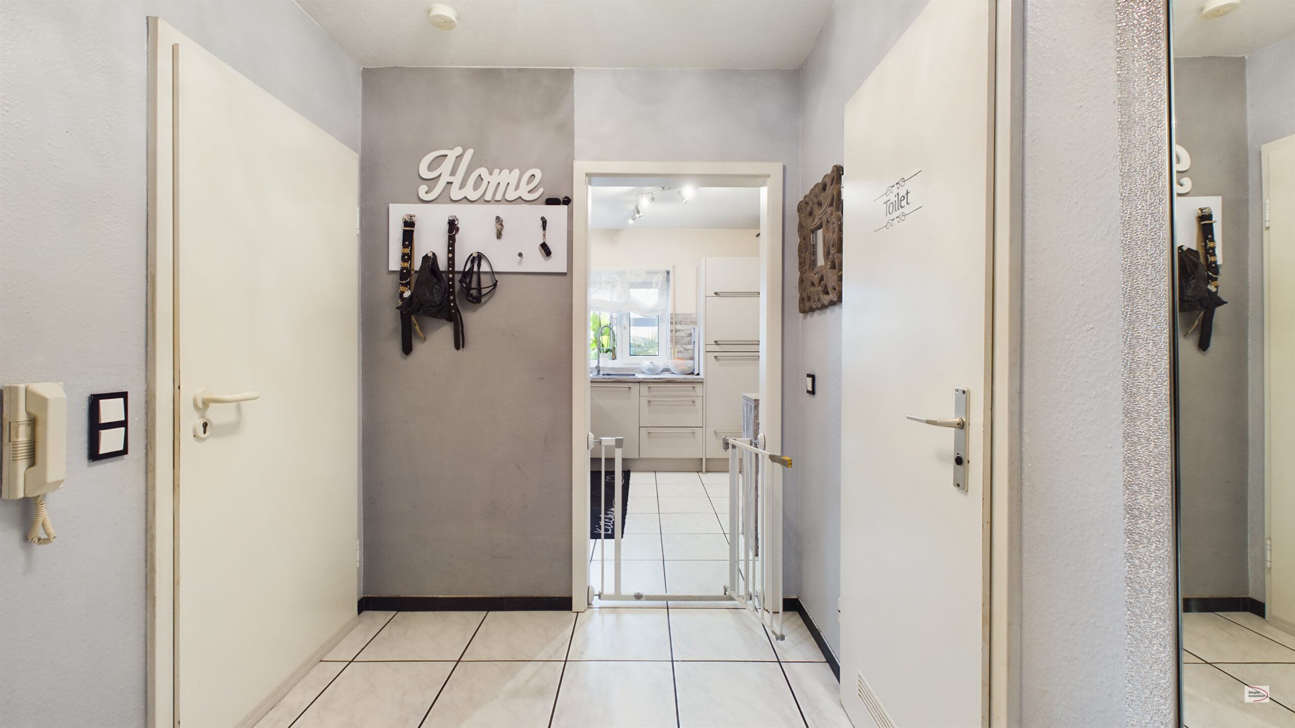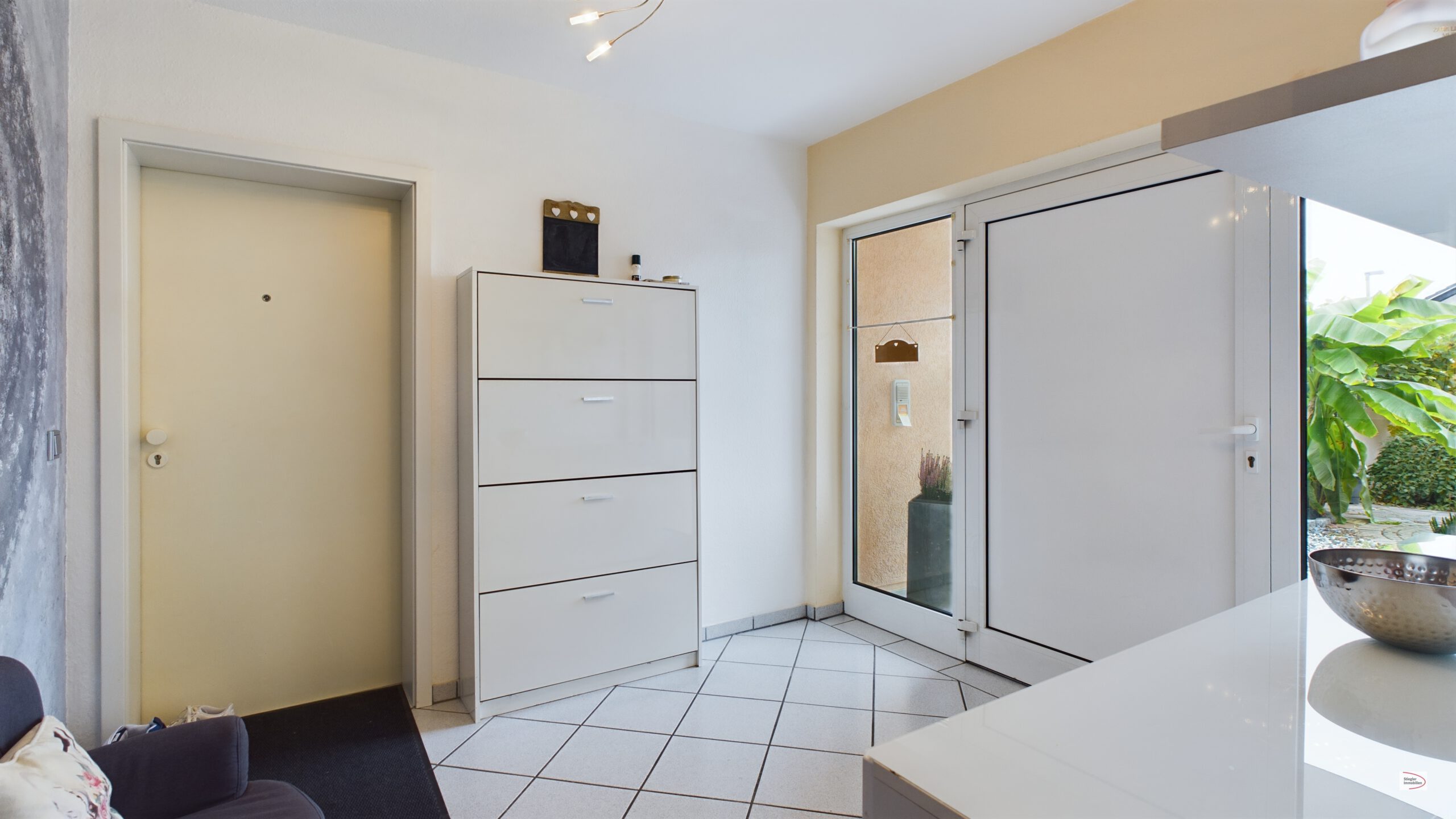 Sie betreten das Grundstück über einen mediterran gestalteten, einladenden Zugangsbereich, der zu einem gemeinsamen Hauseingang führt. Der Zugangsbereich bietet sich als Vorgarten/Sitzbereich an und kann nach eigenem Geschmack gestaltet werden. Das Haus bietet einen Vorraum, der zum Eingang der jeweiligen Haushälfte führt (separate Eingänge links und rechts).